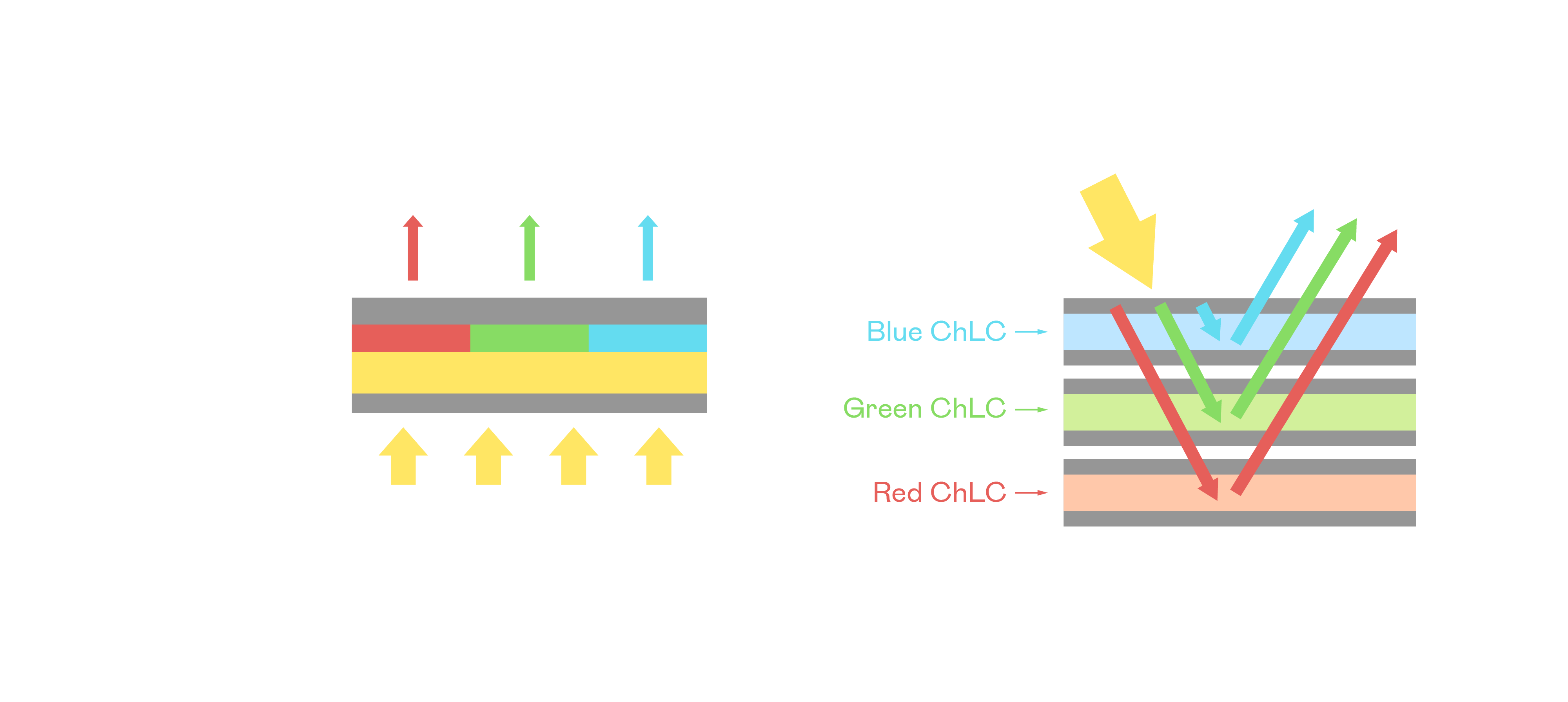 Z6·尊龙时凯膽固醇液晶顯示器是由紅、綠、藍三層膽固醇液晶面板堆疊而成,並採用無彩色濾光片設計,減少環境光在反射過程中的損耗。